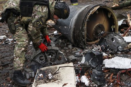 A bomb squad member works next to remains of an unidentified missile at the site where residential buildings were heavily damaged during a Russian missile attack in Kharkiv