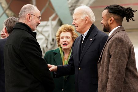 WARREN, Michigan (Reuters) -U.S. President Joe Biden won a strong pledge of support on Thursday from union autoworkers crucial to his reelection bid in Michigan, while protests over his backing of Israel’s actions in Gaza shadowed the trip.